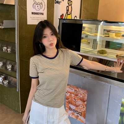 어깨 반팔 타이트 쇼트 스타일 스트라이프 티셔츠