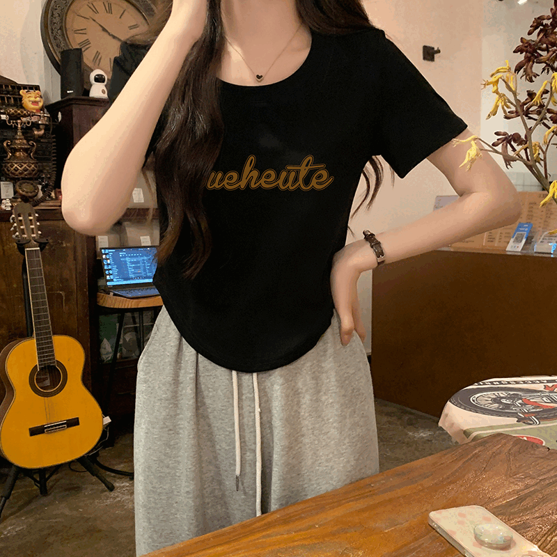 어깨 단락 티셔츠 고급 곡선 밑단 짧은 슬림 하이 허리와 배꼽 핫 걸 탑을 가진 여성
