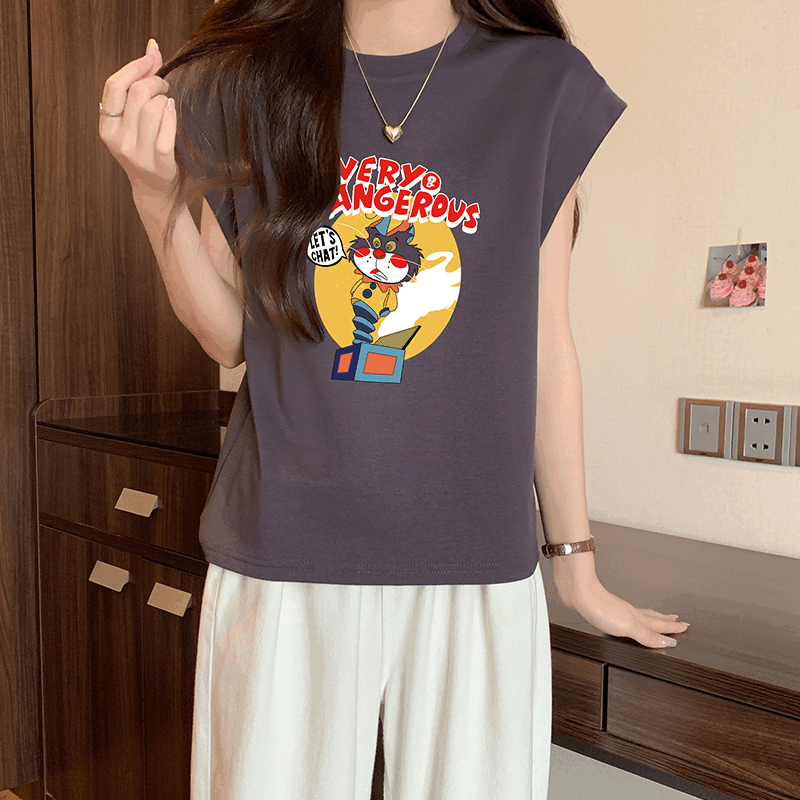 여성을위한 인쇄 둥근 목 티셔츠 느슨한 민소매 여름 새로운 슬림 아메리칸 레트로 탑