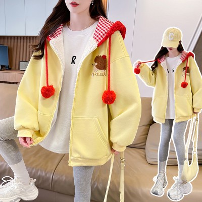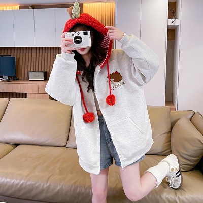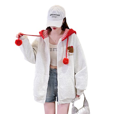 실사 귀여운 만화 자수 디자인 센스 패치워크 털이 있는 후드 여성 코트 2025 새로운 가을 겨울 루즈핏 재킷
