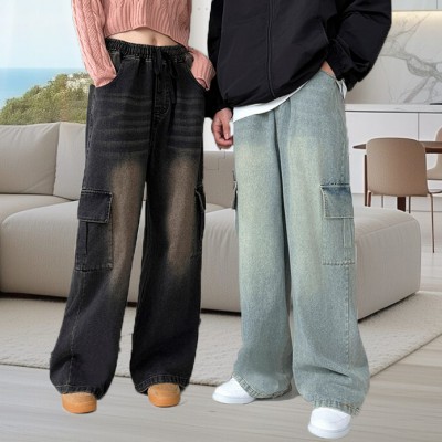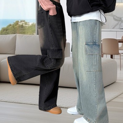 머드워싱 밴딩 카고 데님 와이드 청바지