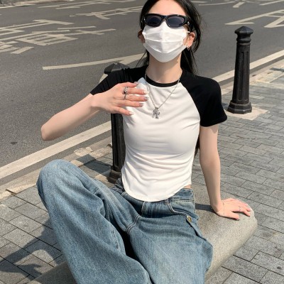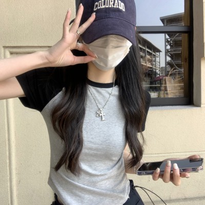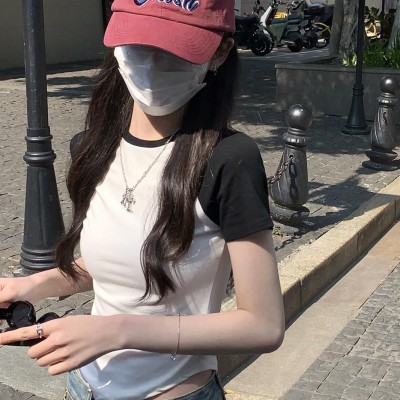 한국 스타일 슬림핏 레이스 주름 반팔 티셔츠